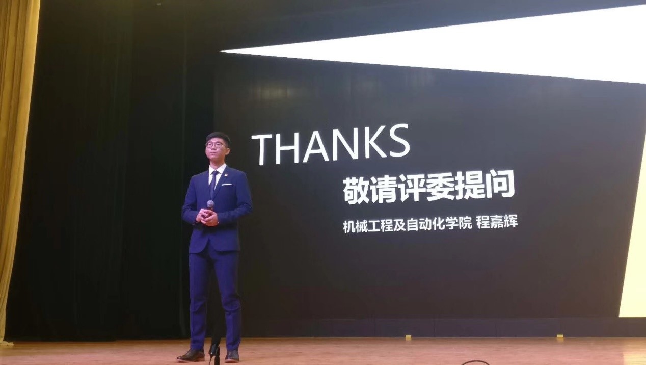 机械学院程嘉辉同学参与了此次评审答辩,从科研、创新、创业等多方面进行了展示,并对评委所提出的问题一一进行了回答,赢得了全场观众及评委的掌声。