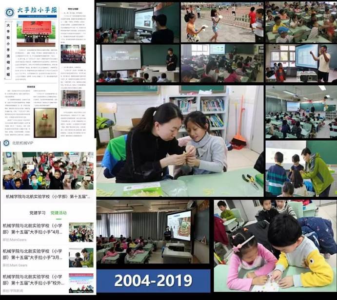 2019年是大手拉小手开展的第十五个年头,共有64名由2016级学生党员、积极分子、社团学生骨干组成的大学生担任北航附小课外辅导员,积极开展多种形式的活动,并通过大手拉小手电子报、机械VIP微信公众号党建模块积极宣传活动精神。5月以来,杨晓涵、孙杰、马静文、郭明智等学生骨干开展了折纸、模型制作等动手实践活动,锻炼了学生动手能力;李禹衡、陈俊宇等学生党员开展了科技前沿小报告,开拓了学生科技视野;学生党员、北航国旗护卫队队长吕宗哲开展了国旗知识小讲堂,增强了学生爱国情怀。在为小学生带来知识的同时,也加强了大学生们的社会责任意识。