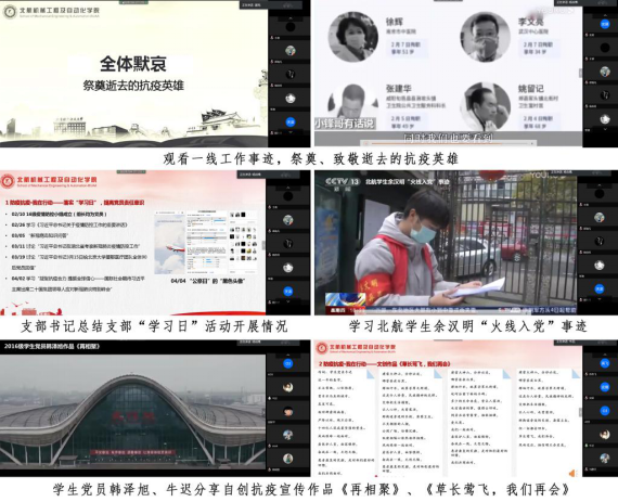 4月5日晚,机械工程及自动化学院2016级本科生党支部围绕“防疫抗疫·我在行动——向奋战在一线的榜样致敬”主题开展支部云视频会议。