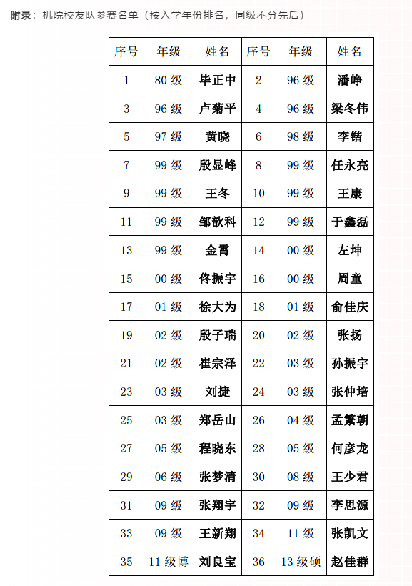 北航机械学院98年建院之时,合并了当年的7系和老10系,将北航校友足球最强势的两支球队收入囊中,而99级本科生殷显峰作为新7系的首任队长,更是以身作则,团结整合两支强大的力量,以极强的责任感和担当,对机械学院的热爱,一直活跃在机院校友足球圈。本届比赛机院校友队更是囊括了上至80级,下至14级横跨34年的诸多校友,他们在赛场上秉承着北航多年来传承下的公平、友爱和拼搏的精神竞技,在赛场下利用校友足球赛的平台以球会友,发扬北航人帮北航人,机械人帮机械人的精神,带动了年轻一代甚至在校生的成长与发展。