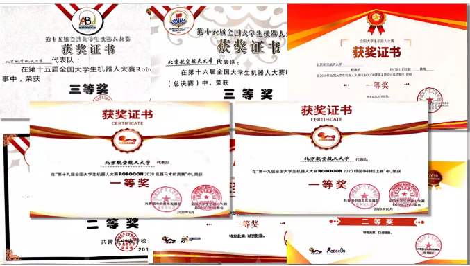 同时,团队在其他比赛中也战果显著,如在“冯如杯”学生学术作品科技竞赛、空中机器人大赛、IRFC格斗机器人大赛等多项竞赛中斩获一等奖或冠军。在学院和校友的大力支持下,在历任队员的无私奉献下,北航机器人队经费充足、技术精湛,外部支持与内部团结相辅相成,推动着北航机器人队不断向前。