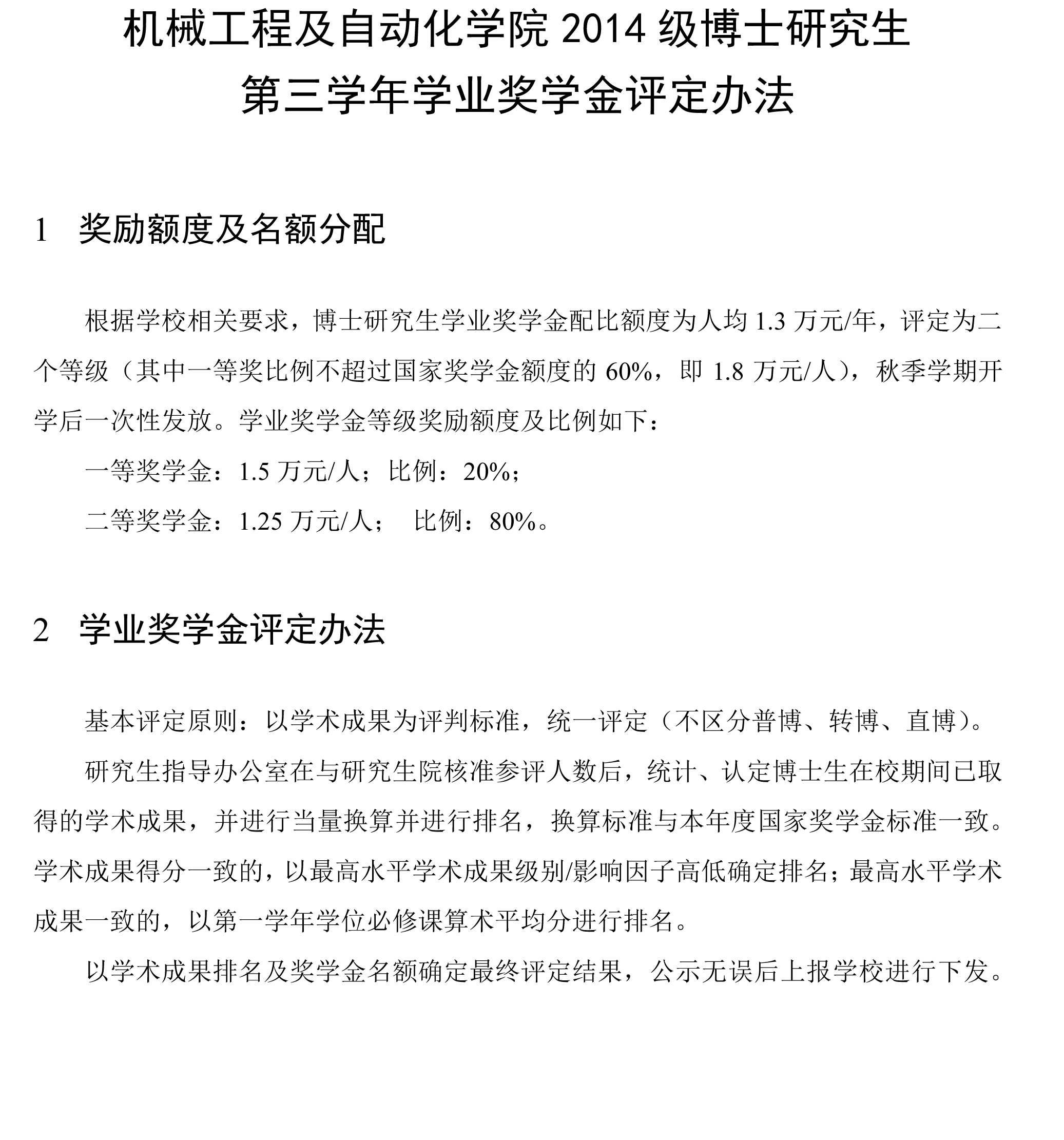 机械工程及自动化学院2014级博士生第三学年学业奖学金评定办法