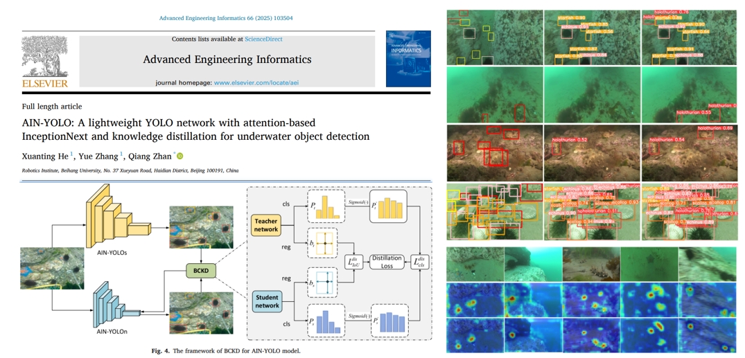 近日,我院机器人研究所战强教授团队,在人工智能领域国际著名期刊《Advanced Engineering Informatics》发表了题为“AIN-YOLO: A lightweight YOLO Network with Attention-based InceptionNext and Knowledge Distillation for Underwater Object Detection”的研究论文。该刊为中科院一区TOP、北航A类期刊,IF 9.9。硕士研究生何轩霆与博士研究生张悦为论文共同第一作者,战强教授为论文唯一通讯作者,北京航空航天大学为唯一完成单位。