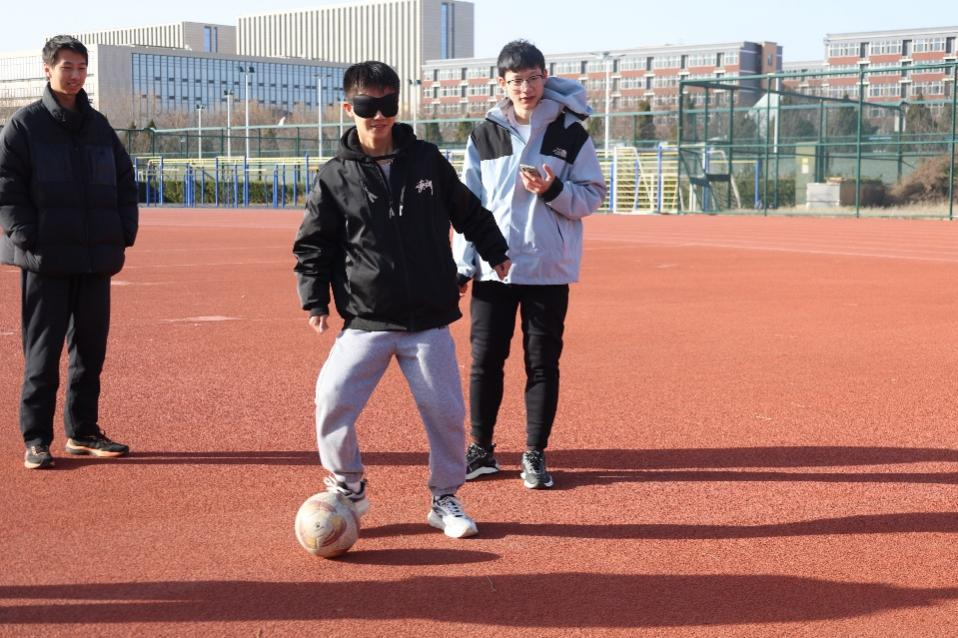 “蒙眼射门”堪称默契考验天花板,两人一组并肩作战,射门者蒙眼转三圈后,全凭队友的语音引导调整方向、果断起脚,有人在默契配合下精准射门,有人却在三圈旋转后晕头转向,进球时的击掌大笑与射中门框的遗憾欢呼,共同构成赛场最鲜活的风景。