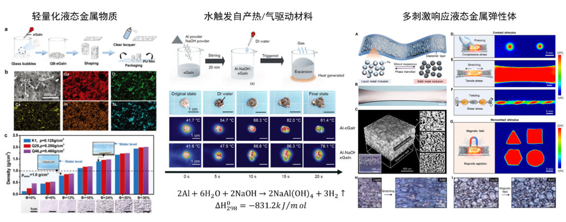 在前述研究基础上,进一步设计面向软体机器人驱动、感知与控制的智能材料体系,设计并制备了一系列具有不同功能的液态金属基复合材料,如多场响应液态金属弹性体、轻量化液态金属物质、液态金属-丝网复合材料及水激发自产热/气驱动材料并据此设计了可快速使用的智能绷带等,实现了在多种刺激条件下的刚度调控、驱动可控与自感知功能,拓展其在复杂和非结构化环境下的应用潜力。