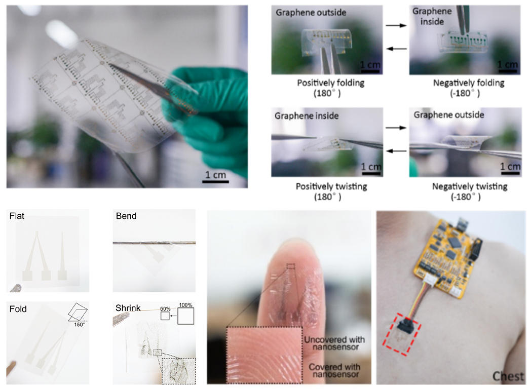 图2 柔性石墨烯FET芯片可穿戴设计及其机械性能探究